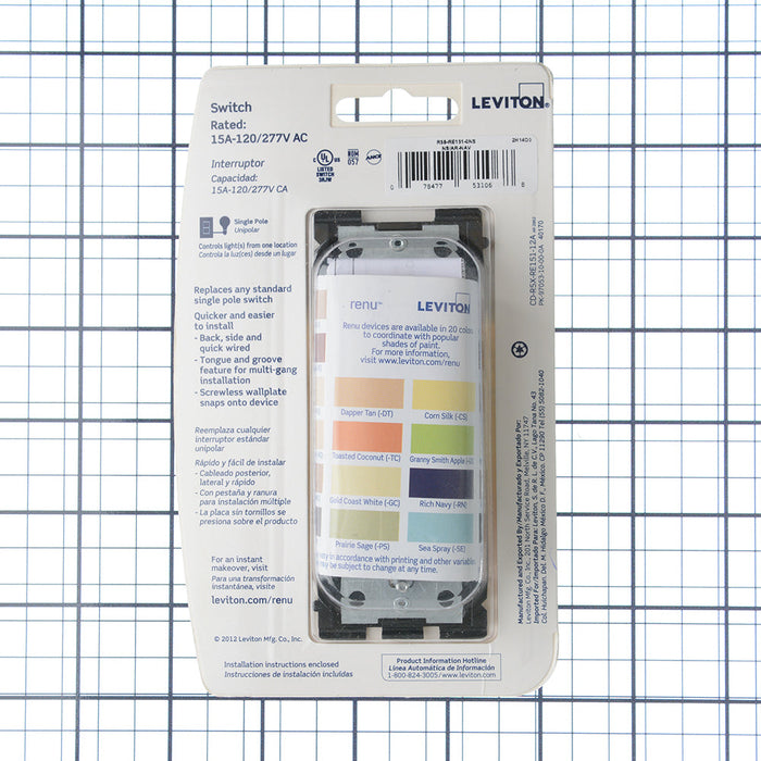 Leviton Renu® Switch RE151-NS for Single Pole Applications, 15A-120/277VAC, in Navajo Sand. NOTABLE FEATURES: Renu in a snap! Renu is the smart new line of decorative electrical products from Leviton. Install Renu and get a fresh stylish look, plus the ability to change the color of any Renu device when you update a room. Designed for do-it-yourselfers, the line includes switches, outlets, GFCIs, dimmers, and sleek, screwless wallplates available in 20 designer colors to blend in or contrast with your decor. Refresh the color of any Renu device in a snap, without any rewiring or the need for an electrician. Just order a color change kit in the color you want, snap off the faceplate on the device and snap on the new face. Add a coordinating wallplate (sold separately) to finish the look. Renu fits your lifestyle and adapts to your changing taste.